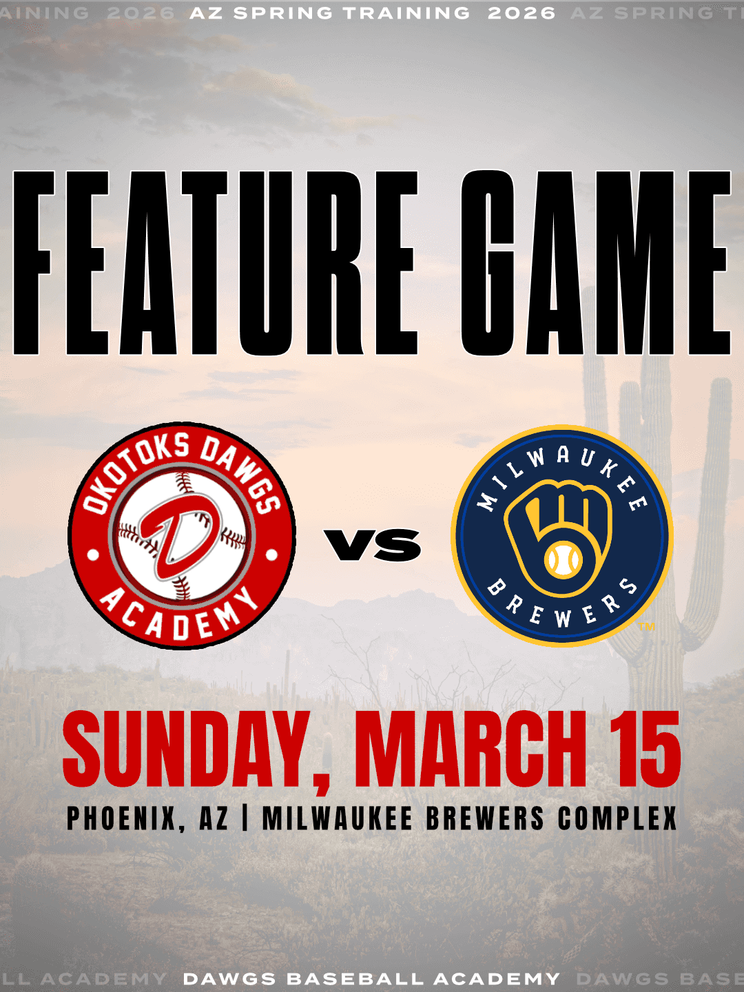The Okotoks Dawgs Academy are excited to announce their 2026 Arizona Spring Training Schedule including a feature game against the Milwaukee Brewers on Sunday, March 15, 2026. This unique opportunity offers Dawgs players a rare chance to test their talents against the Brewers’ up & comping prospects, and is a first for the Dawgs program.